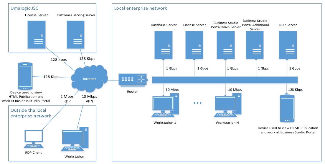 There are no special speed requirements to the channel to use Business Studio Portal (see Portal) or HTML Publication (see html).